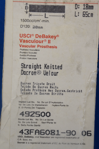 Bard 492500 USCI DeBakey Vasculour II Vascular Prosthesis Diameter 18mm, Length 65cm