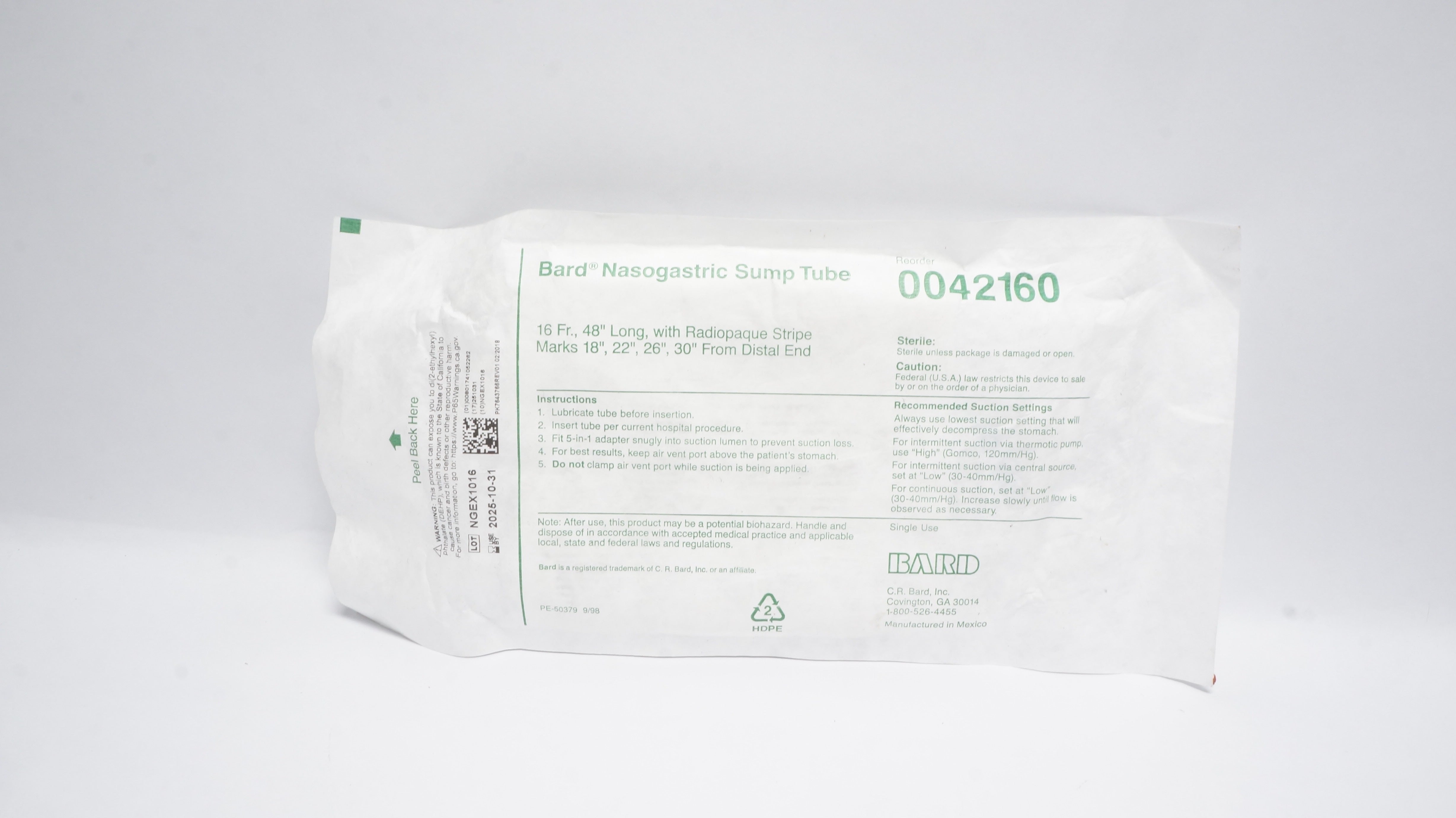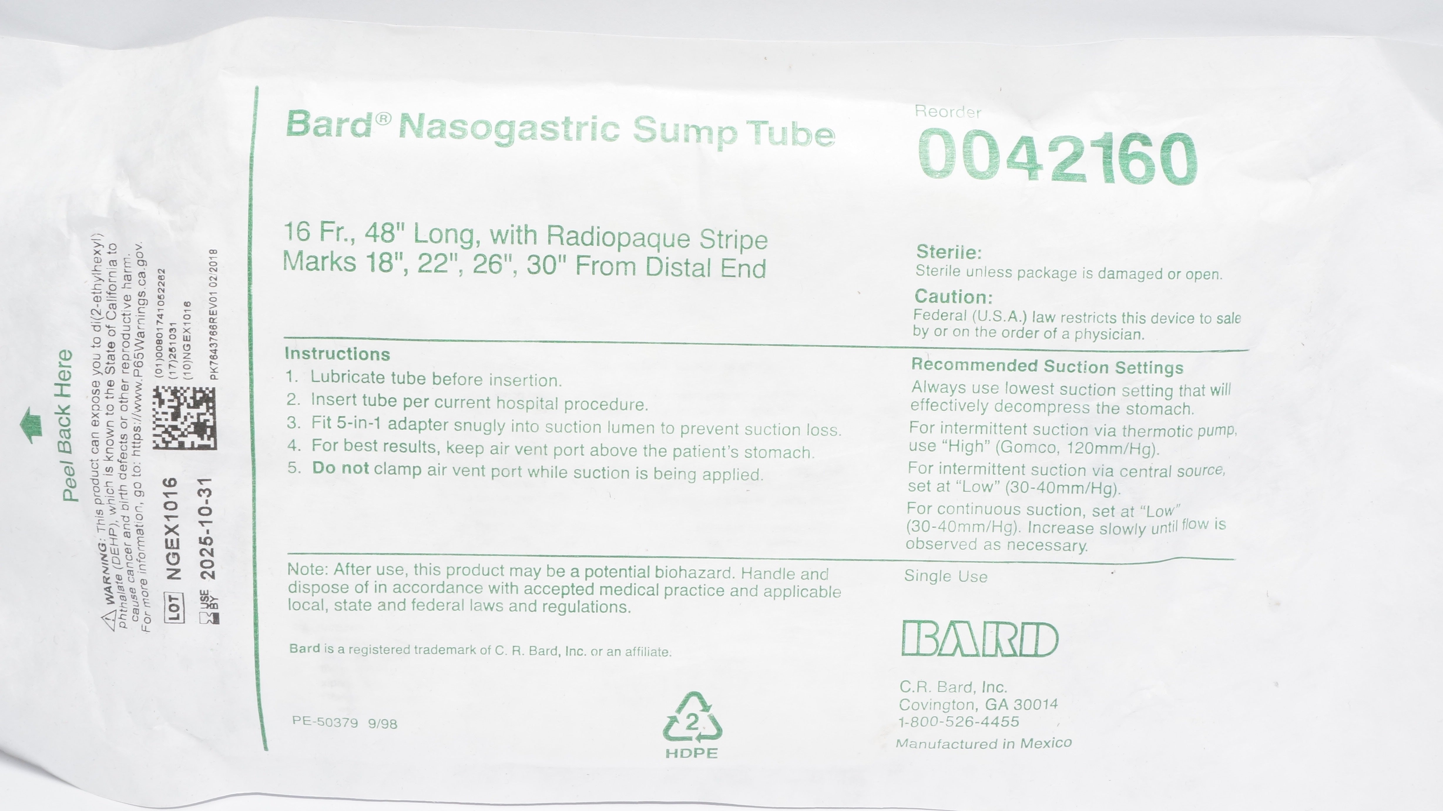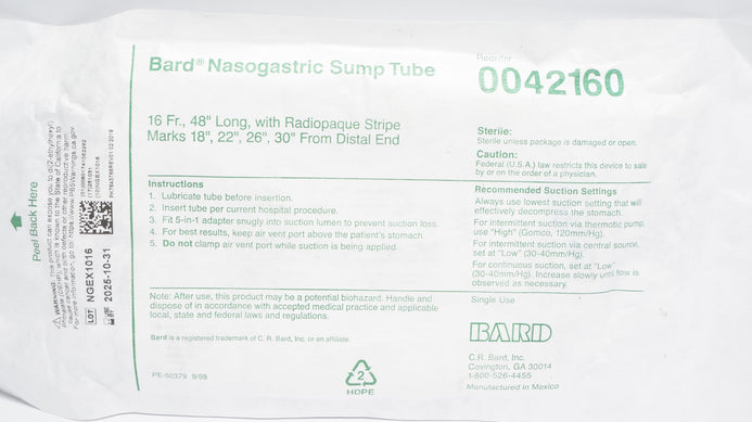 - Bard EN0042160 Nasogastric Sump Tube 16Fr x 48inch