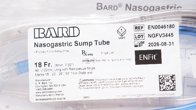 Bard EN0046180 Nasogastric Sump Tube w/Radiopaque Stripe Marks 18Fr x 48inch