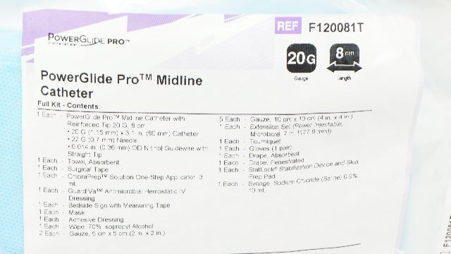 - Bard F120081T PowerGlide Pro Midline Cath. Full Kit, 20G x 8cm (x)