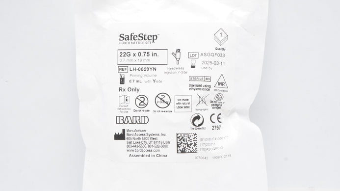 - Bard LH-0029YN SafeStep Ndle Set 22G x 0.75inch Priming Volume 0.7ml with Y-Site