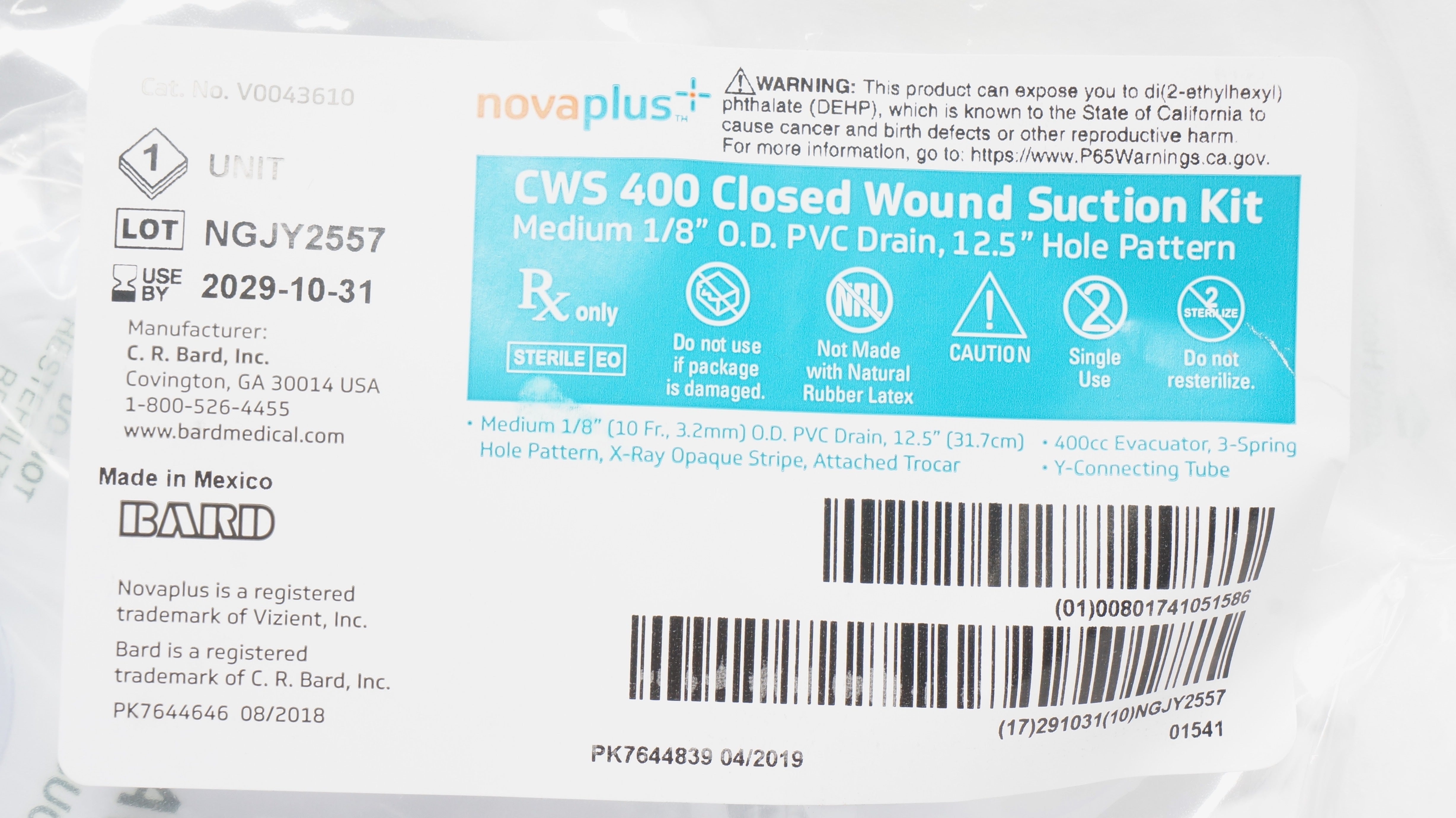 - Bard V0043610 Novaplus CWS 400 Closed Wound Suction Kit