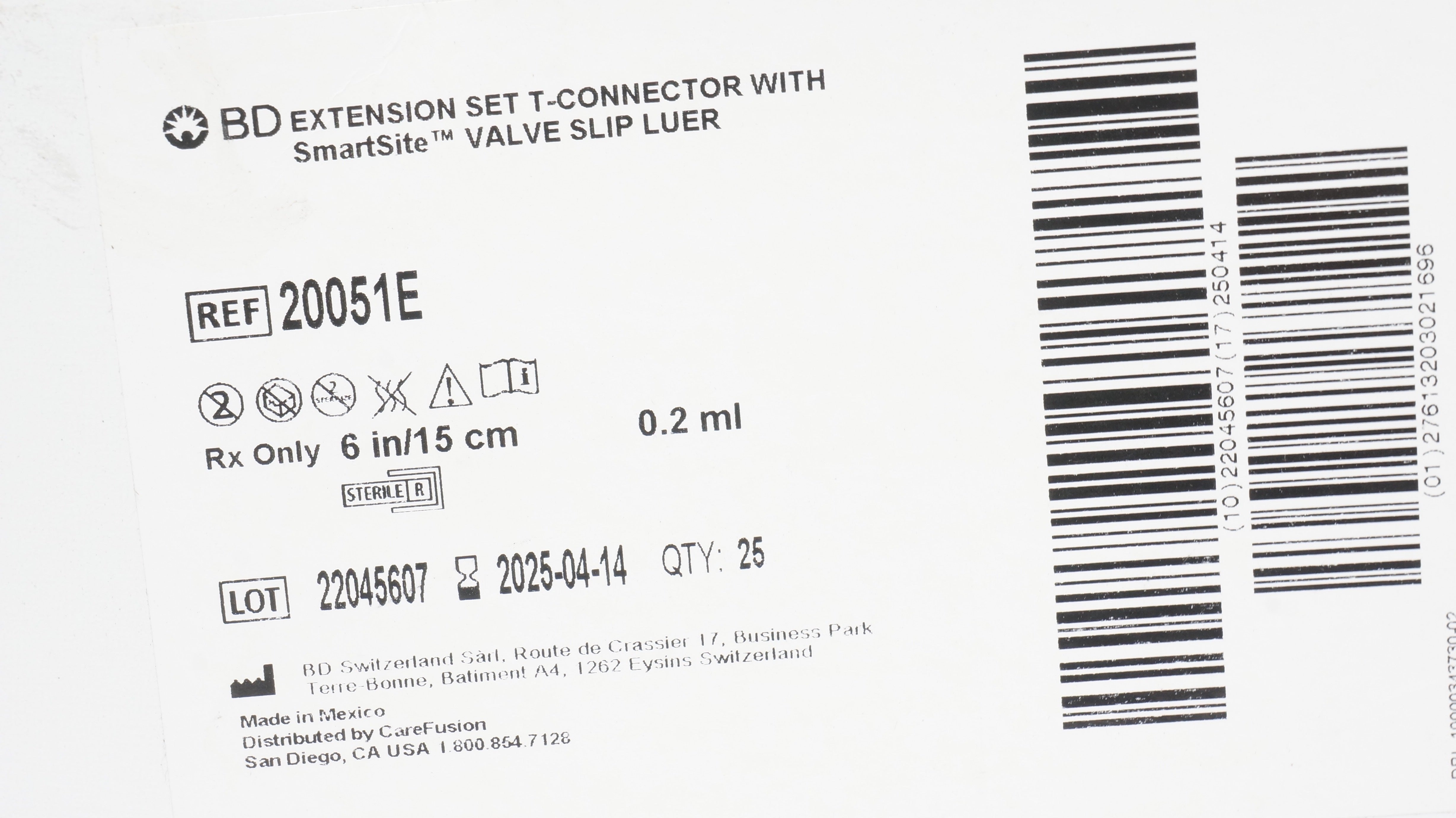 - BD 20051E Extension Set T-Connector w/SmartSite Valve Slip Luer (x) - Box of 25