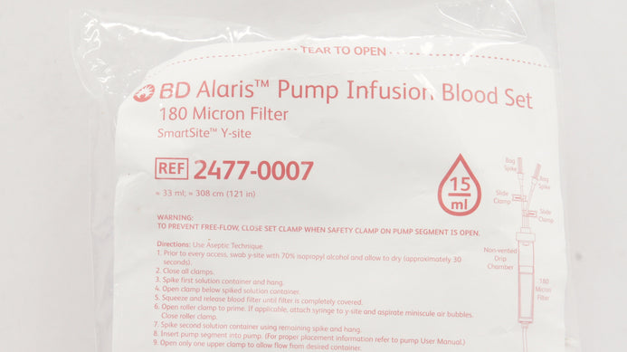 - BD 2477-0007 Alaris Pump Infusion Blood Set 180 Micron Filter 33ml x 121inch