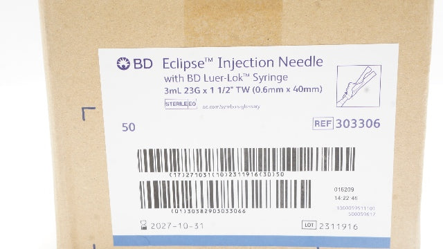BD 303306 Eclipse Injection Needle W/Syringe 3mL 23G x 1 1/2inch TW