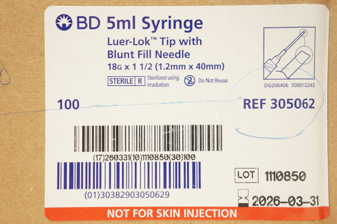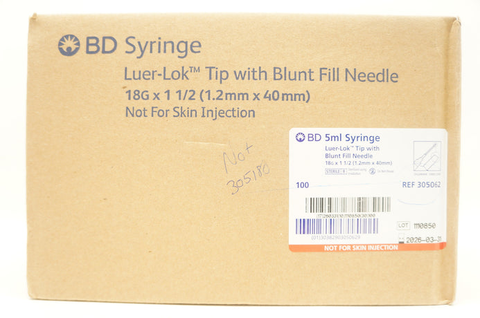 - BD 305062 5 ml Syringe Luer-Lock Tip Blunt Fill Ndle 18G x 1-1/2in - Case of 100