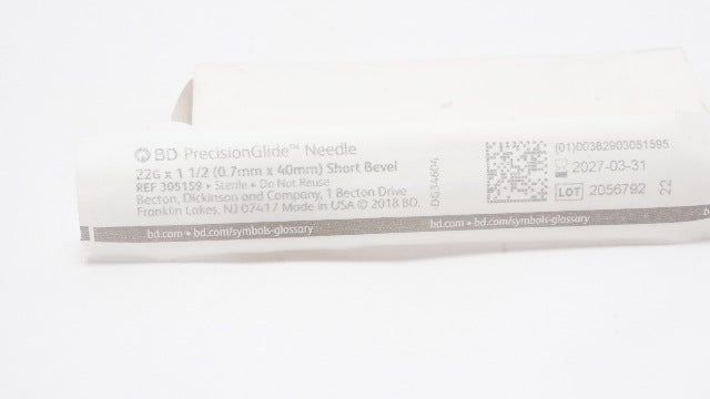 BD 305159 PrecisionGlide Needle 22G x 1-1/2 Short Bevel