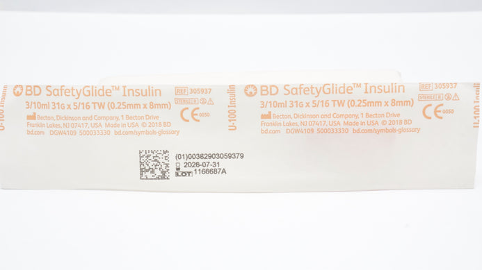 - BD 305937 SafetyGlide U-100 Insulin Syringe 3/10ml 31G x 5/16TW
