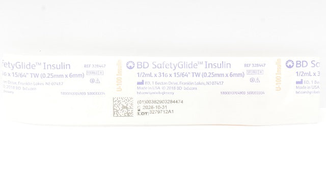 - BD 328447 SafetyGlide U-100 Insulin Syringe 1/2mL x 31G x 15/64inch TW