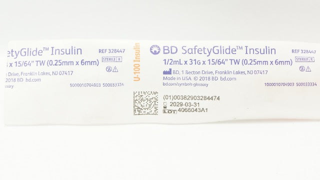 - BD 328447 SafetyGlide U-100 Insulin Syringe 1/2mL x 31G x 15/64inch TW