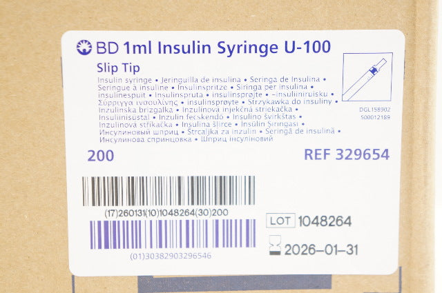 - BD 329654 1ml Insulin Syringe U-100 Slip Tip - Case of 200