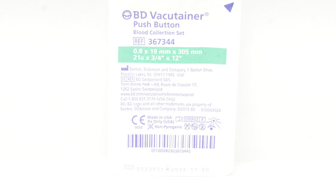 BD 367344 Vacutainer Push Button Blood Collection Set 21G x 3/4inch x 12inch