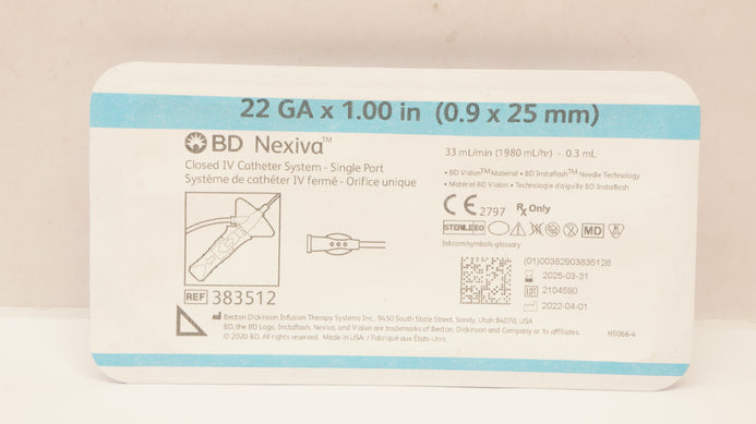 BD 383512 Nexiva Clodsed IV Cath. System - Single Port 22GA x 1.00inch 33Ll/min