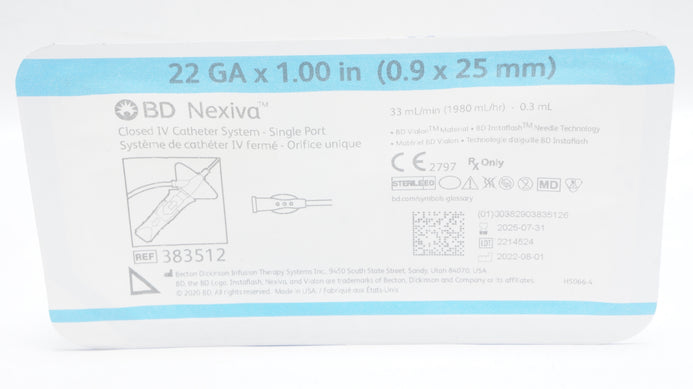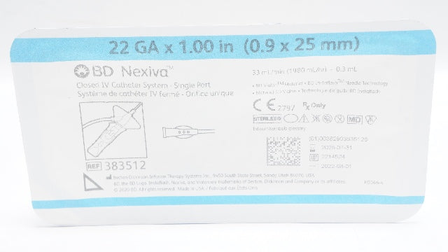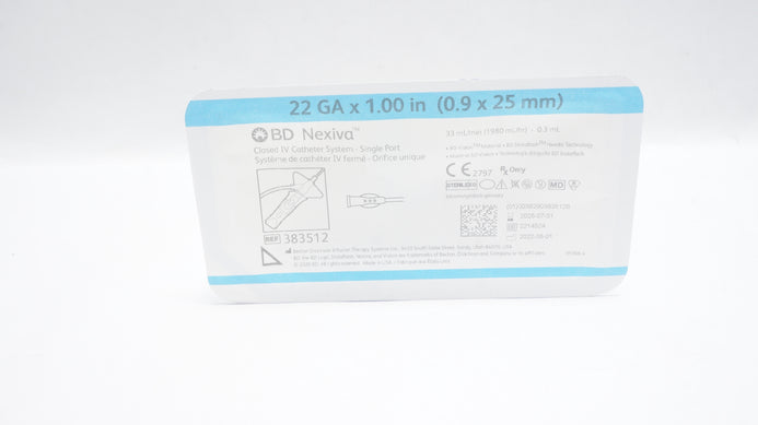 BD 383512 Nexiva Clodsed IV Cath. System - Single Port 22GA x 1.00inch 33Ll/min