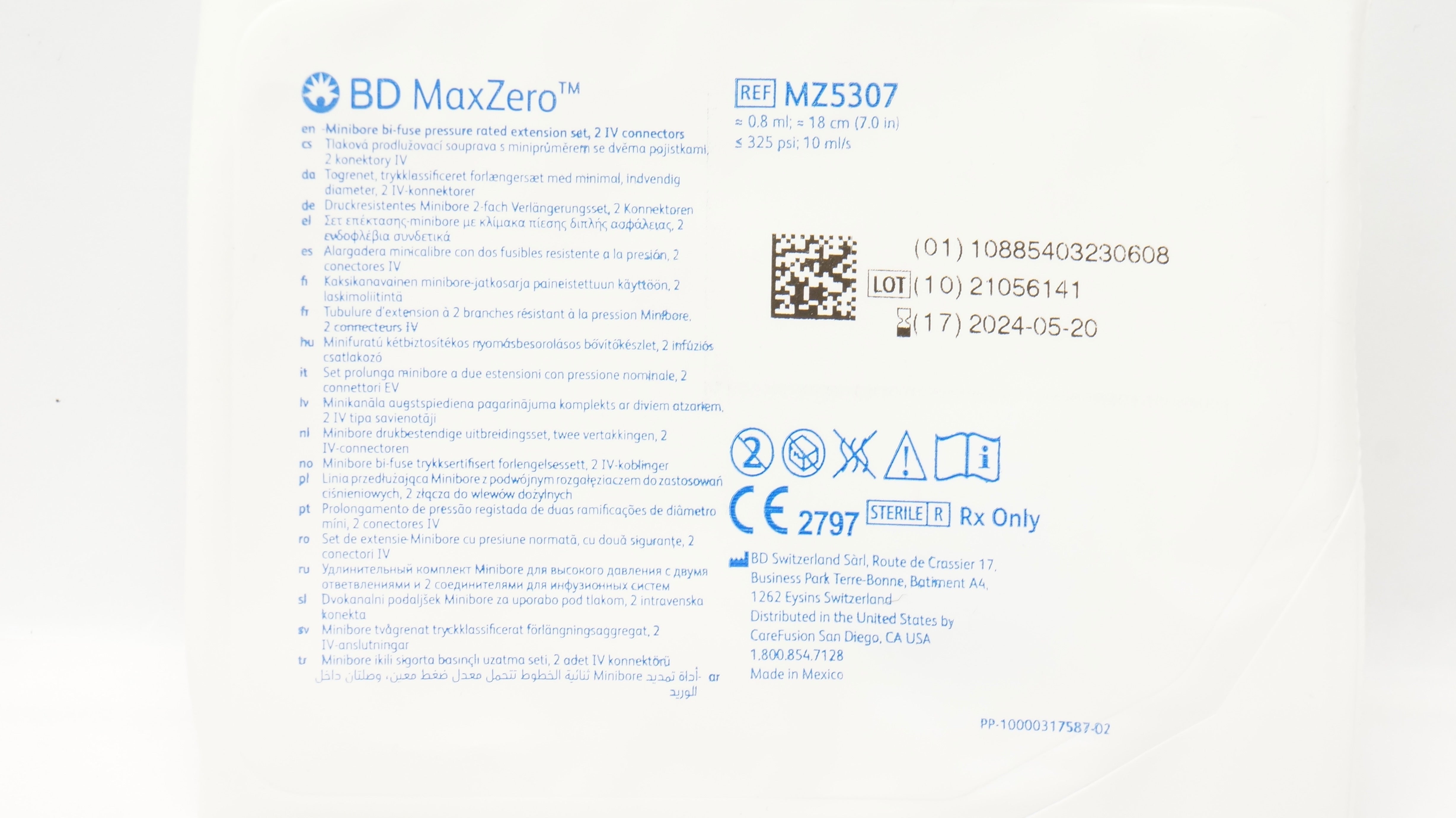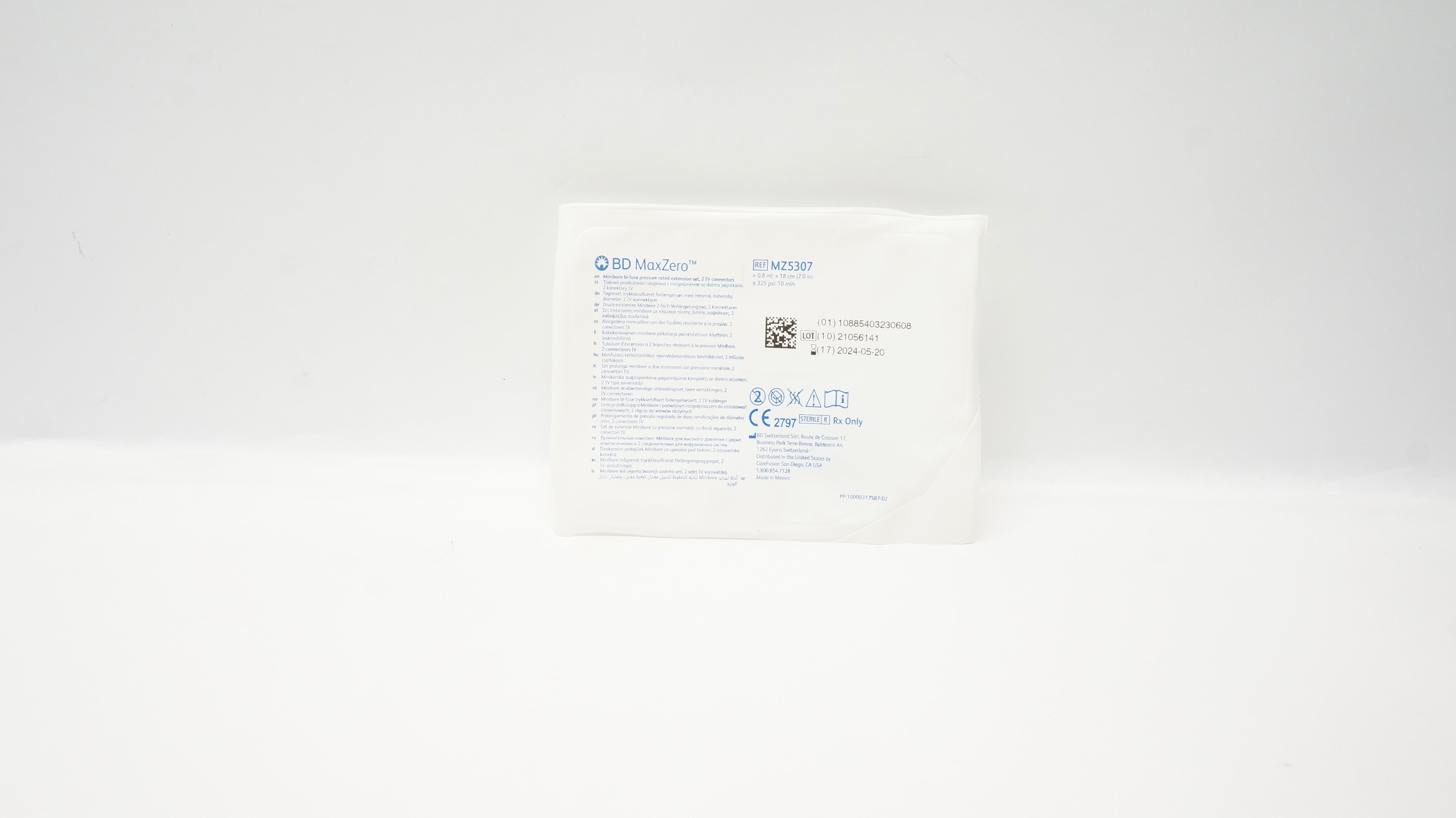 - BD MZ5307 MaxZero Microbore Bi-Fuse Extension Set 2 IV Connectors 7inchx0.8mL(x)