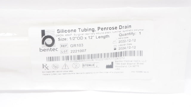 Bentec Medical GR103 Radiopaque Silicone Tubing, Penrose Drain 1/2inch x 12inch