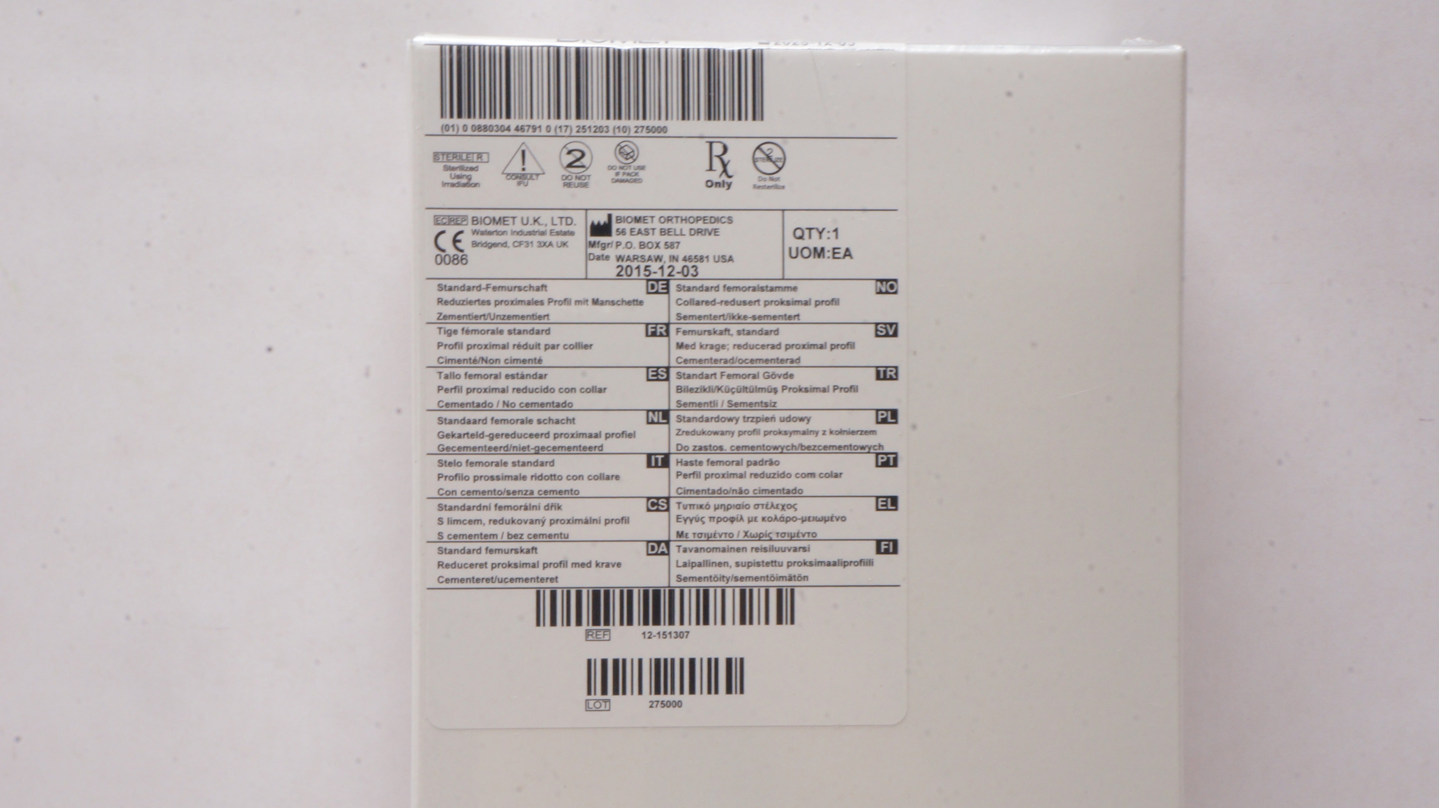- Biomet 12-151307 Echo FX HIP System Standard Femoral Stem Size 7, 120mm Type 1