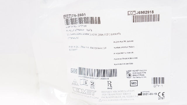 - Biomet 76-2601 Ribfix Blu System Titanium 8Hole Plate 2.423 x .238 x .063inch