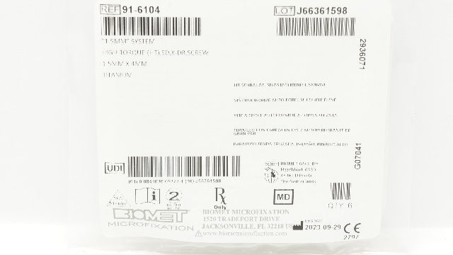 Biomet 91-6104 High Torque, SD, X-DR, Screw, Titanium 15mm x 4mm - Pack of 6
