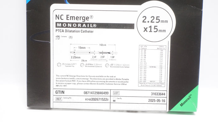 Boston Scientific 392671522 NC Emerge Monorail PTCA Dilatation Cath 2.25x15mm(x)