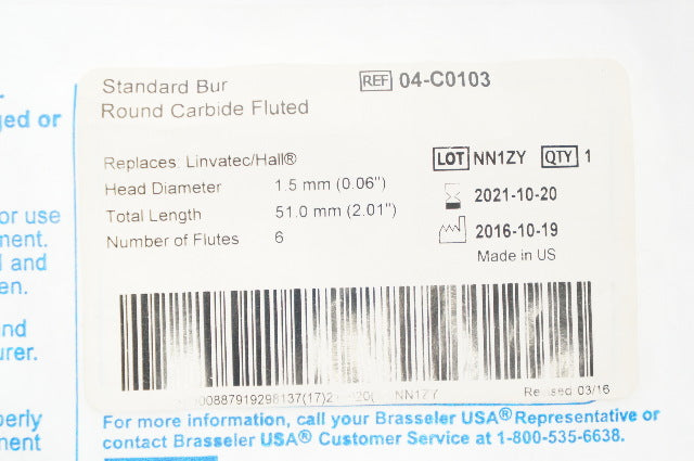 - Brasseler 04-C0103 Standard Bur Round Carbide Fluted 6 Flutes 0.06 x 2.01inch(x)