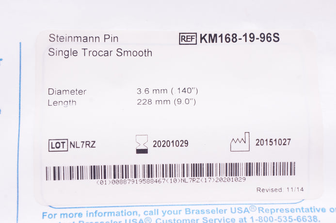 Brasseler KM168-19-96S Steinmann Pin Single Trocar Smooth 140 x 9.0in.