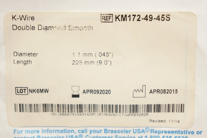 Brasseler KM172-49-45S K-Wire Double Diamond Smooth 0.45inch x 9.0inch (x)
