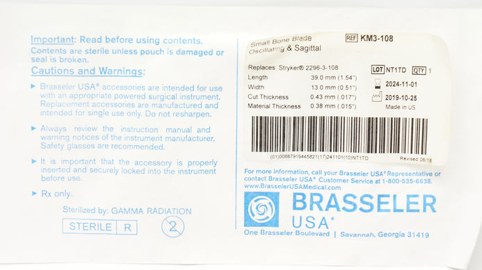 - Brasseler KM3-108 Small Bone Blade Oscillating & Sagital 1.54 x 0.51 x 0.017inch