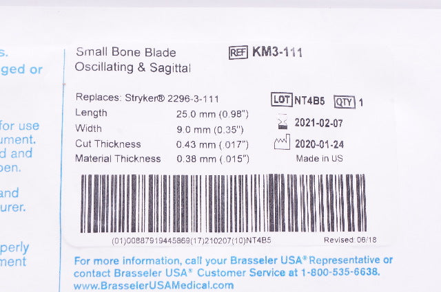 Brasseler KM3-111 Small Bone Blade Oscillating & Sagittal 0.98 inch x 0.35 inch x .017 inch