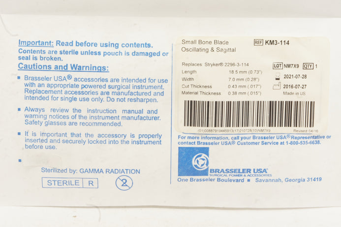 Brasseler KM3-114 Small Bone Blade Oscillating & Sagittal 0.73 inch x 0.28 inch x .017 inch x .015inch