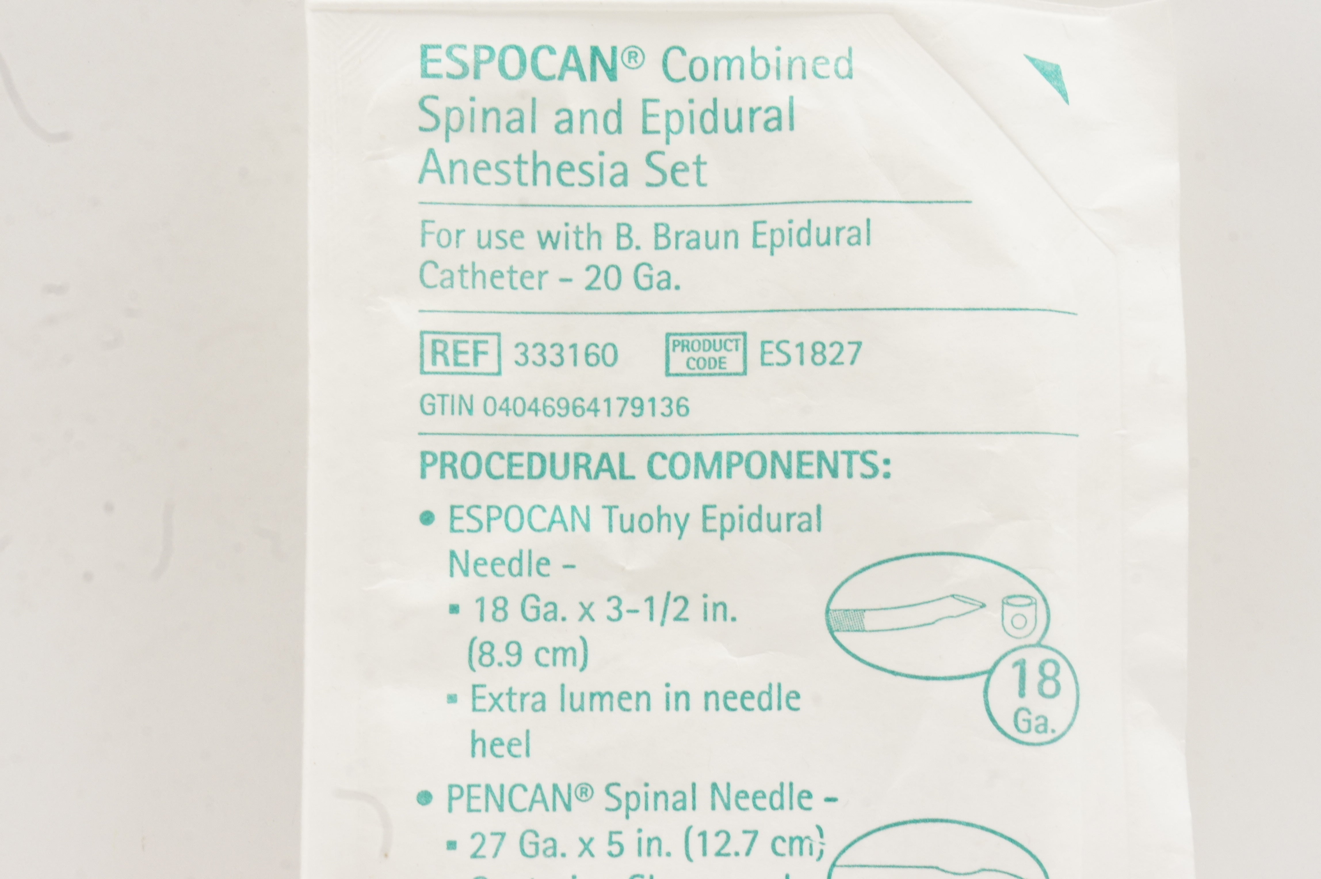 Braun 333160 Espocan Combined Spinal and Epidural Anesthesia Set 18Ga x 27Ga