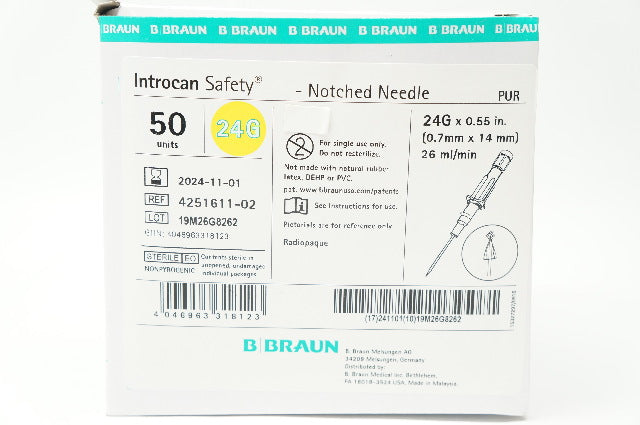 - Braun 4251611-02 Introcan Safety Notched Ndle 24G x 0.55inch 26mL/min -Box of 50