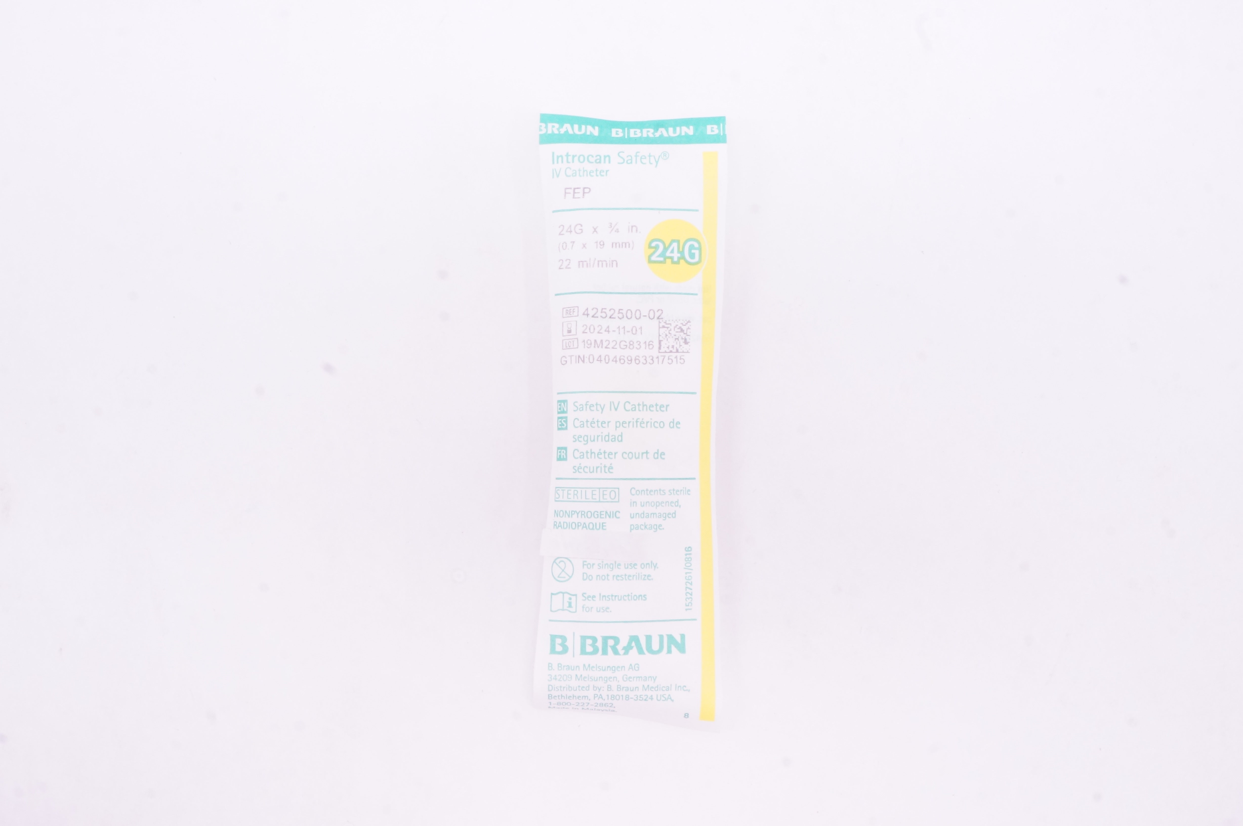 Braun 4252500-02 Introcan Safety IV Cath. 24G x 3/4in. 22ml/min