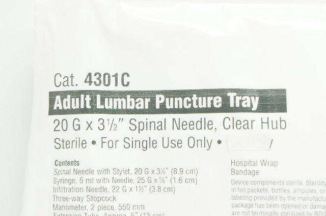 CareFusion 4301C Adult Lumbar Puncture Tray 20G x 3-1/2inch Spinal Ndle