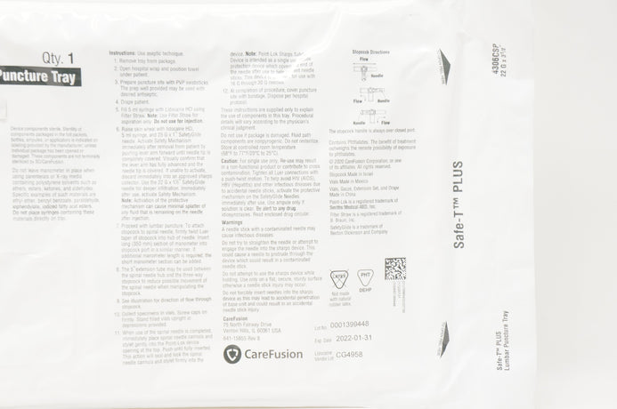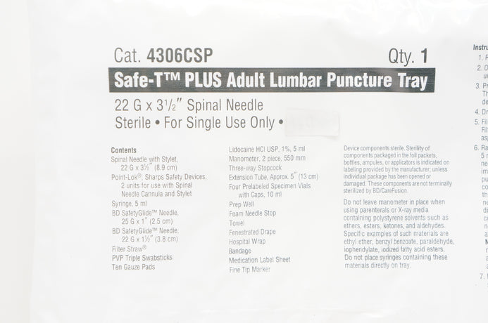CareFusion 4306CSP Safe-T Plus Adult Lumbar Puncture Tray, Ndle 22G (x)
