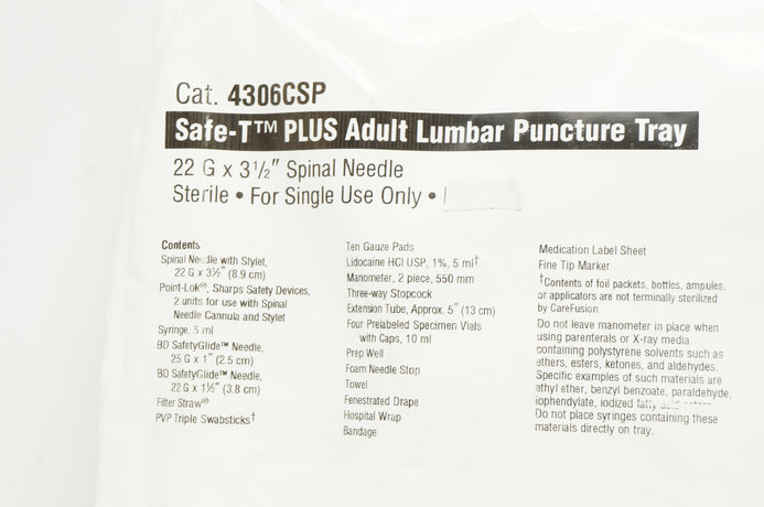 - CareFusion 4306CSP Safe-T PLUS Lumbar Puncture Tray w/Ndle 22Ga x 3 1/2inch (x)