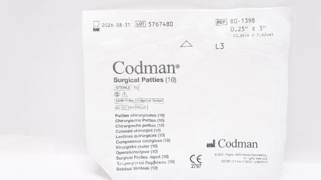 Codman 80-1398 Surgical Patties, 0.25inch x 3inch - Pack of 10