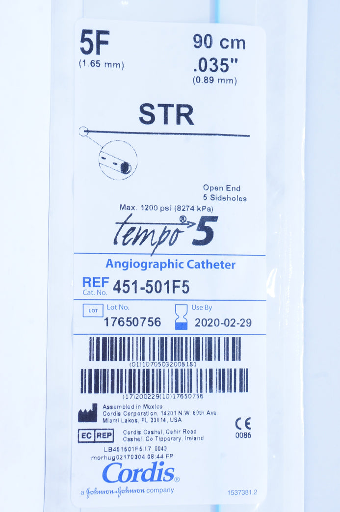 Cordis 451-501F5 Tempo 5 Angiographic Catheter STR Open End, 5 Sideholes, Max 1200 psi, 5 F x 90cm x .035in.