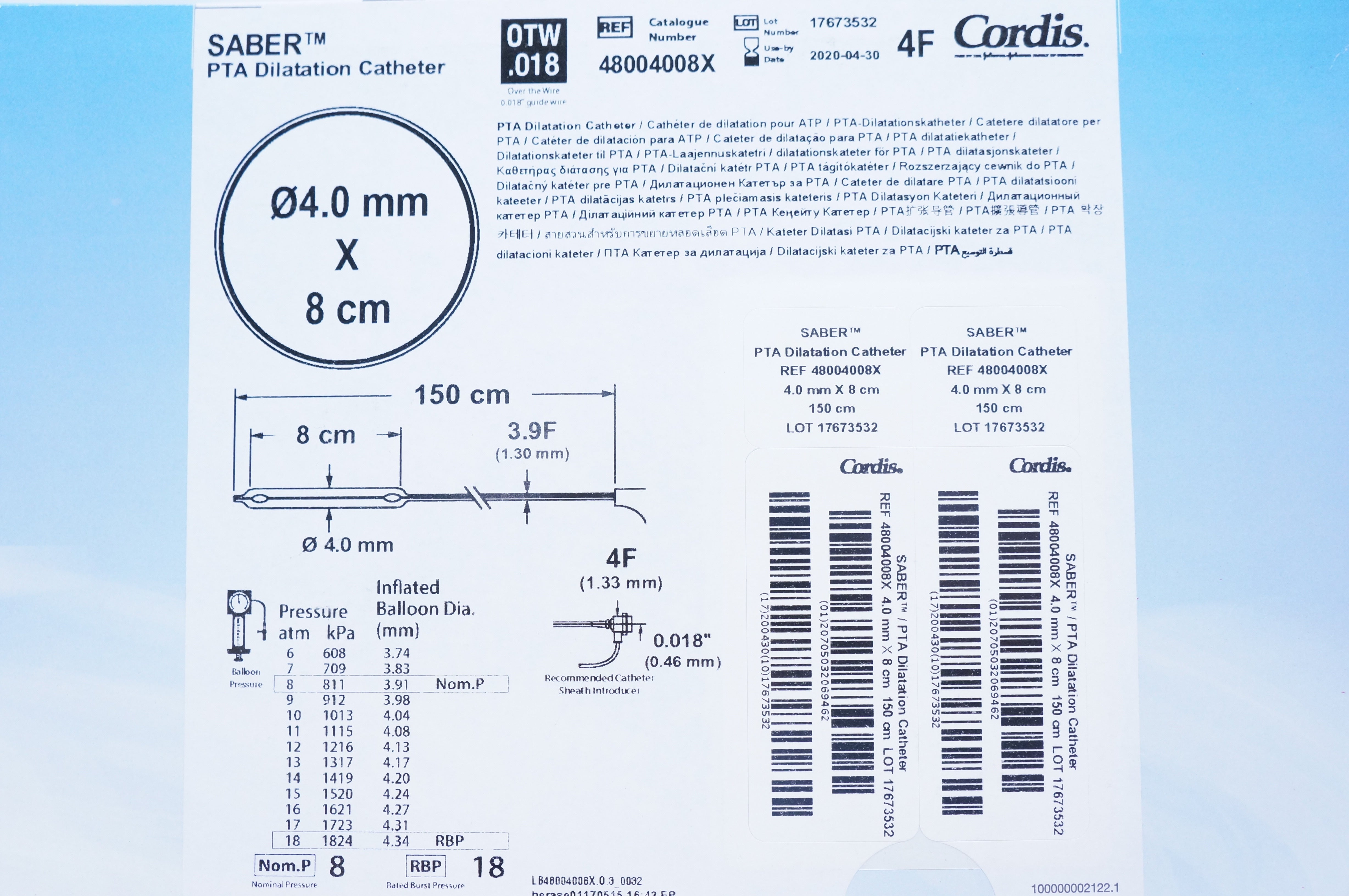 Cordis 48004008X SABER PTA Dilatation Catheter 4F, 4.0mm x 8cm