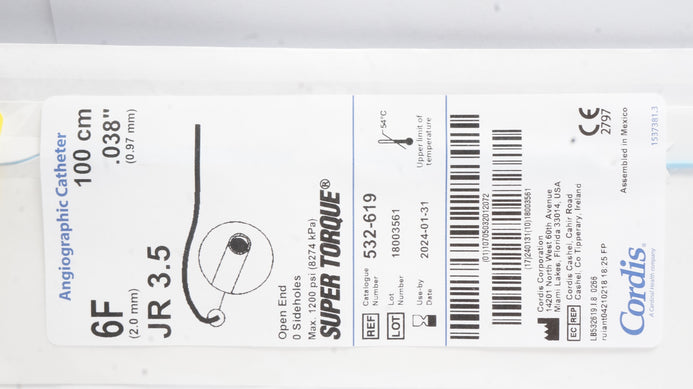 - Cordis 532-619 JR 3.5 Super Torque Angiographic Cath. 6F x .038inch x 100cm (x)