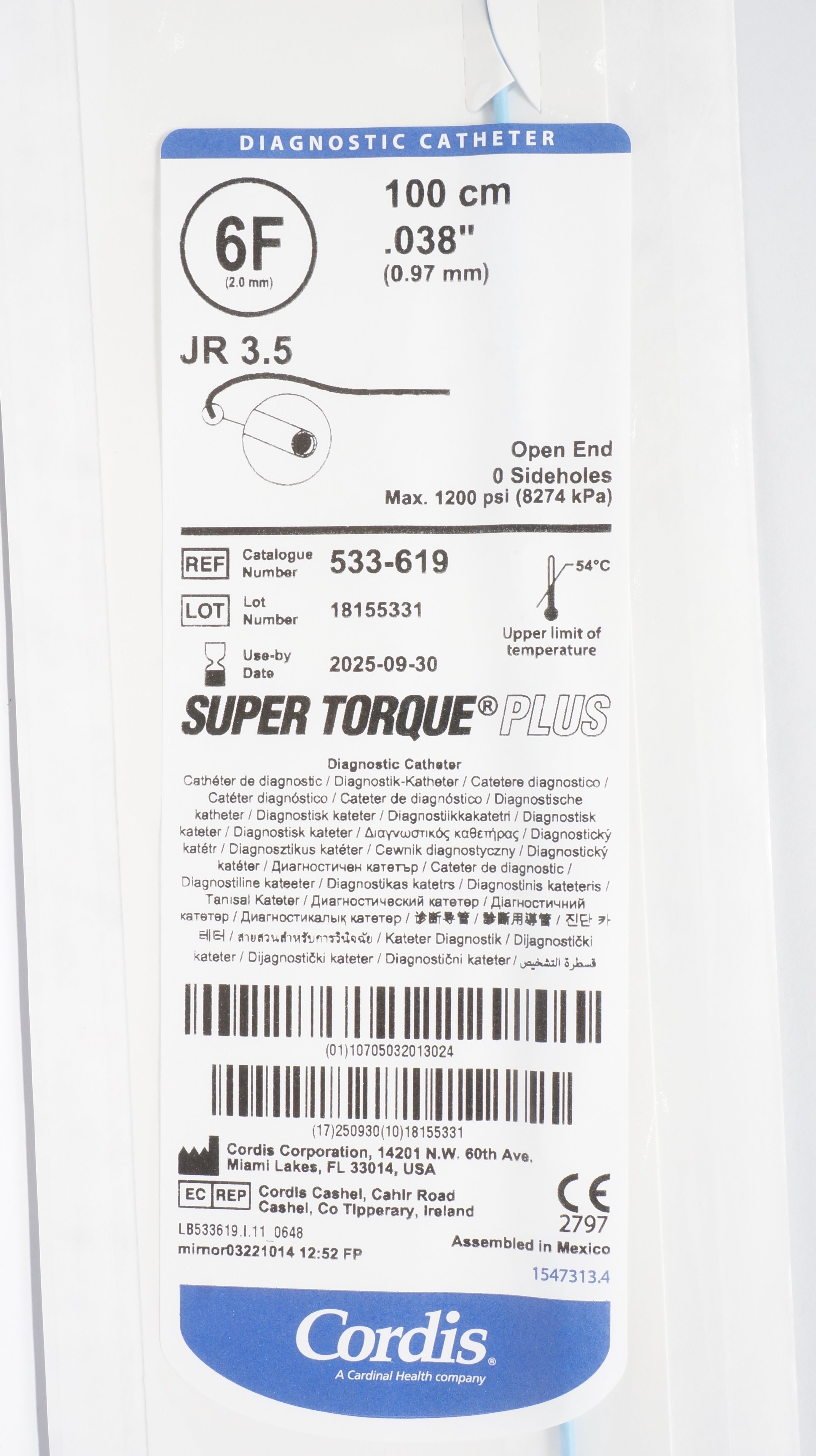 Cordis 533-619 Super Torque Plus JR3.5 Diagnostic Cath. 6 x .038in x 100cm (x)