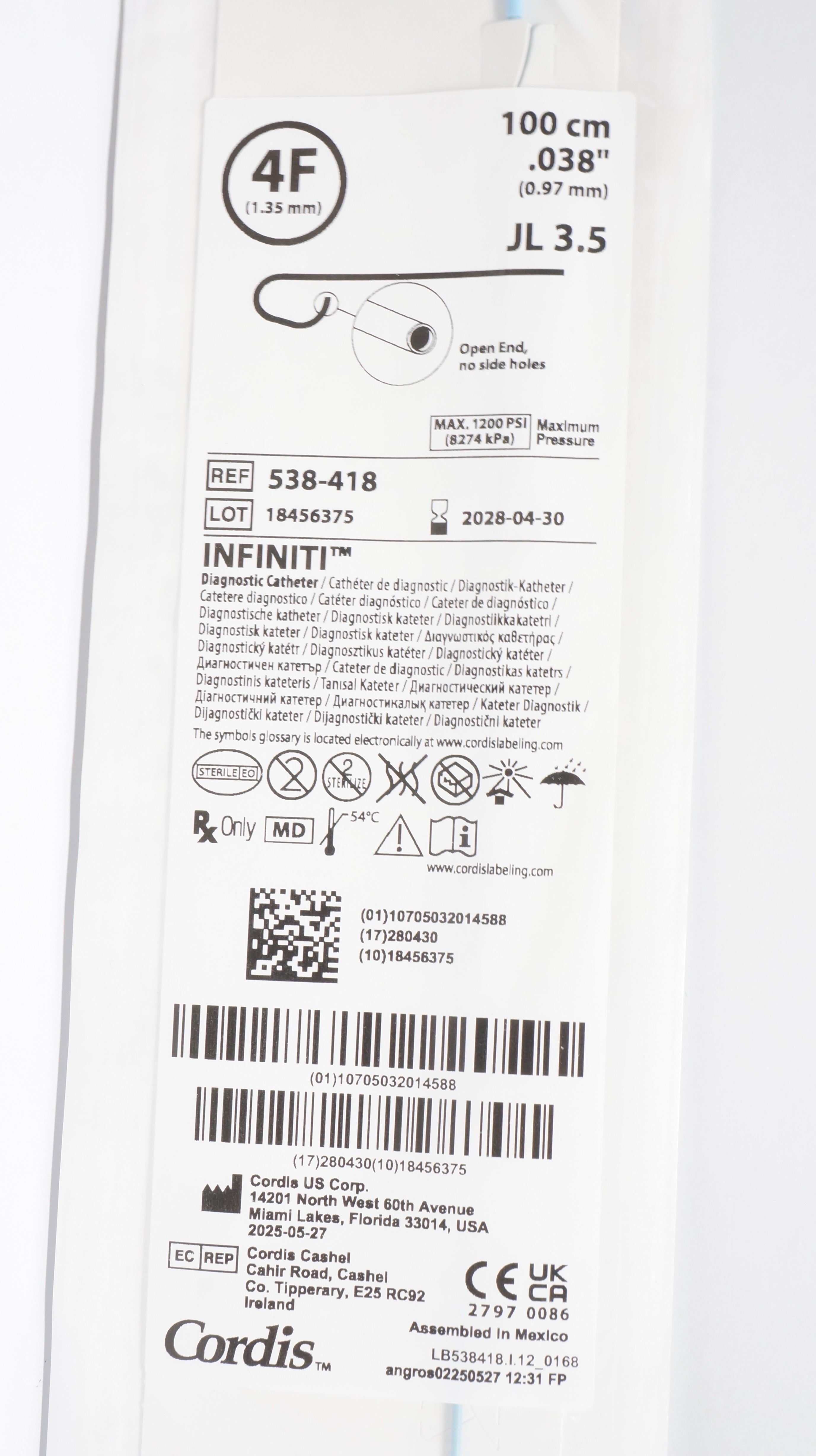 Cordis 538-418 JL 3.5 Infiniti Diagnostic Catheter 4F x 100cm x .038inch
