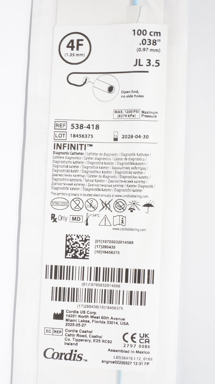 Cordis 538-418 JL 3.5 Infiniti Diagnostic Cath. 4F x 100cm x .038inch