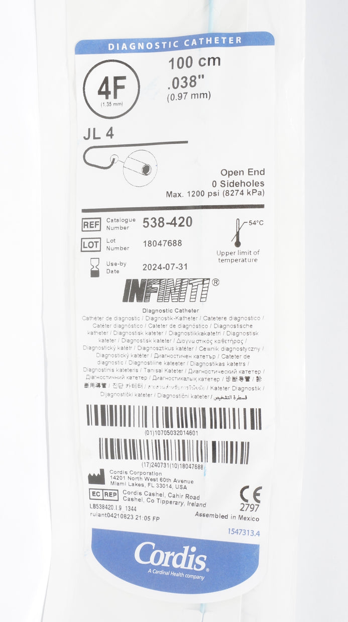 Cordis 538-420 Infiniti Diagnostic Cath. JL 4 4F x 100cm x .038inch (x)