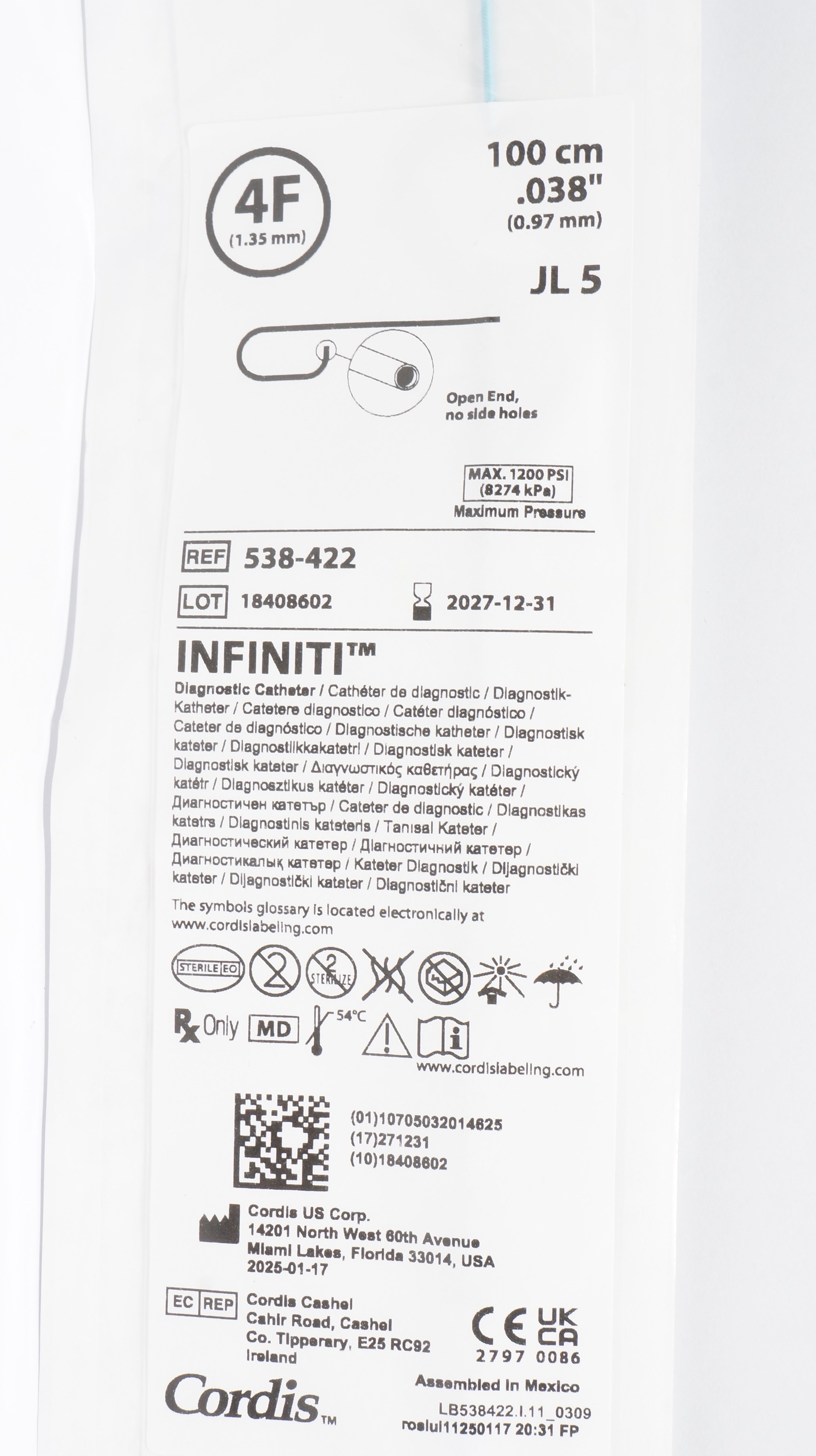 - Cordis 538-422 Infinity JL 5 Diagnostic Cath. 4F x 0.38inch x 100cm