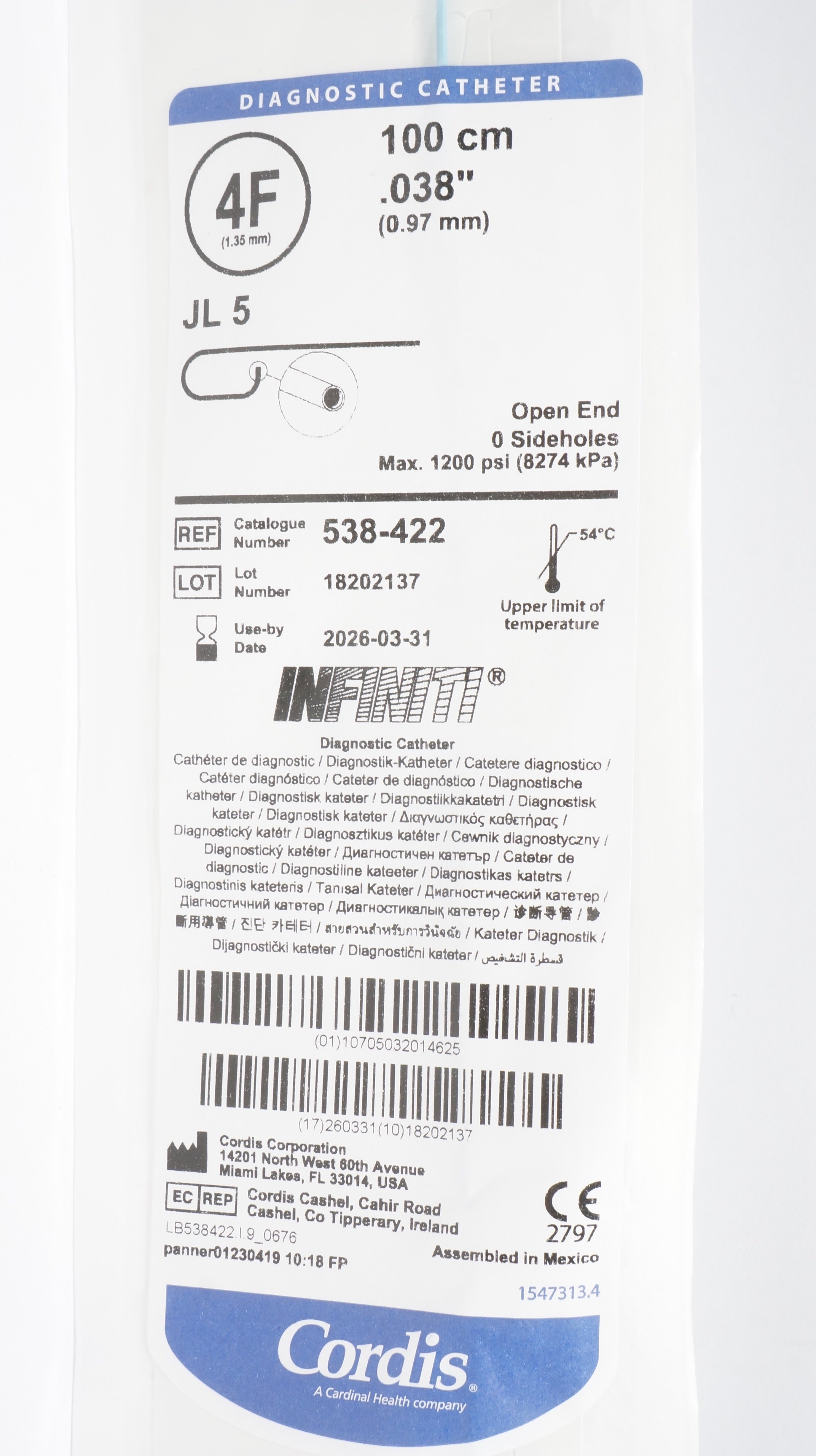 - Cordis 538-422 Infinity JL 5 Diagnostic Cath. 4F x 0.38inch x 100cm