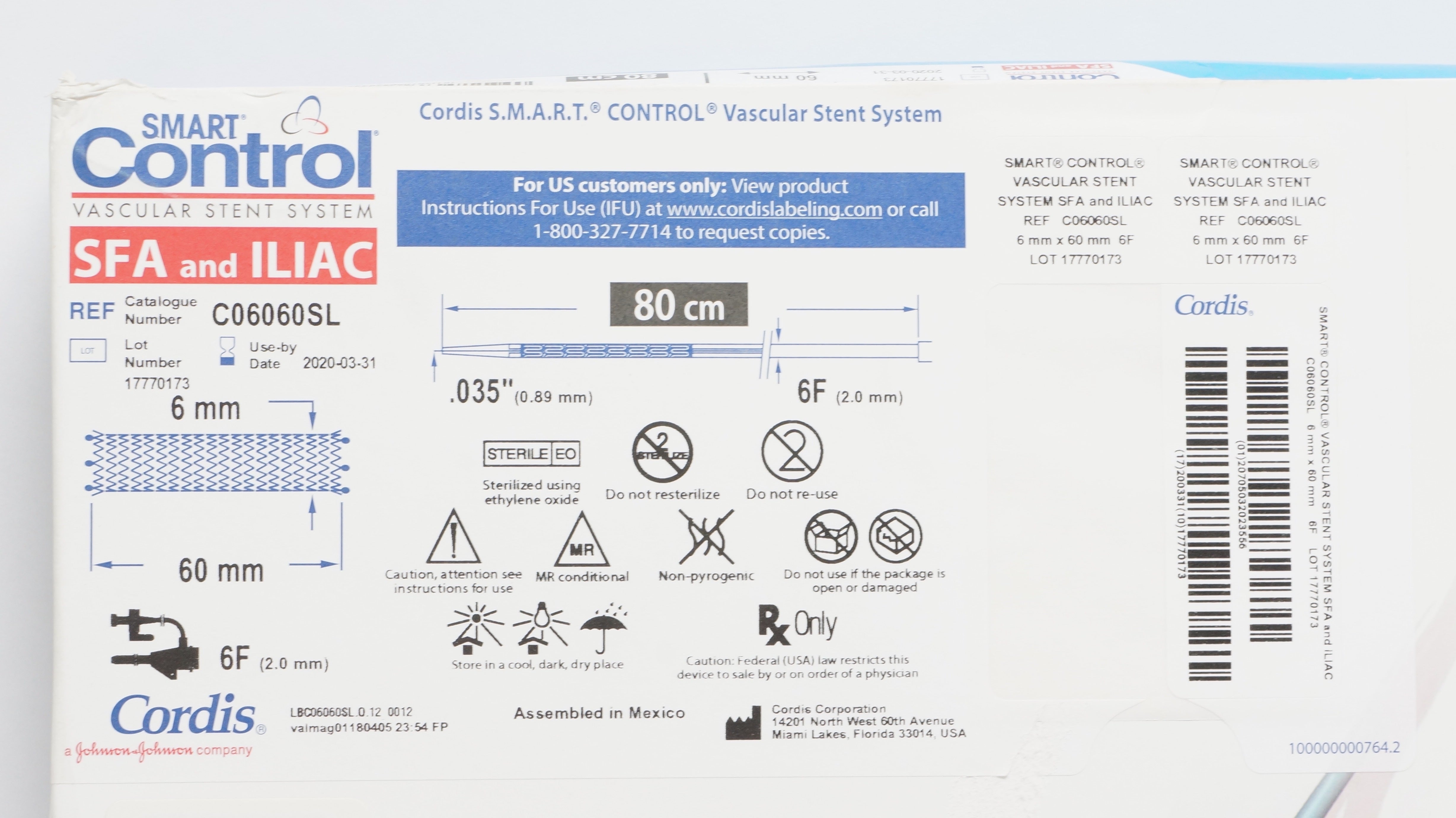 Cordis C06060SL S.M.A.R.T. Control Vascular Stent System 6mm x 60mm 6F, 80cm (x)
