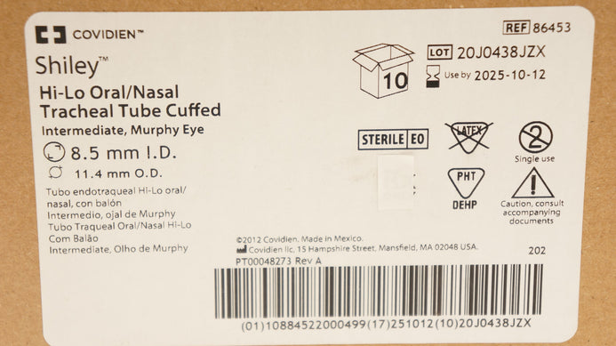 Coviden 86453 Shiley Hi Lo Oral/Nasal Tracheal Tube Cuffed 8.5x11.4 mm- Box of 5