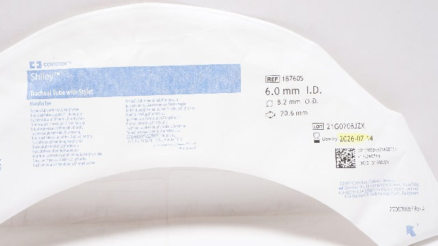 - Covidien 18760S Shiley Tracheal Tube w/Stylet 6.0mm I.D. x 8.2mm O.D. x 20.6mm