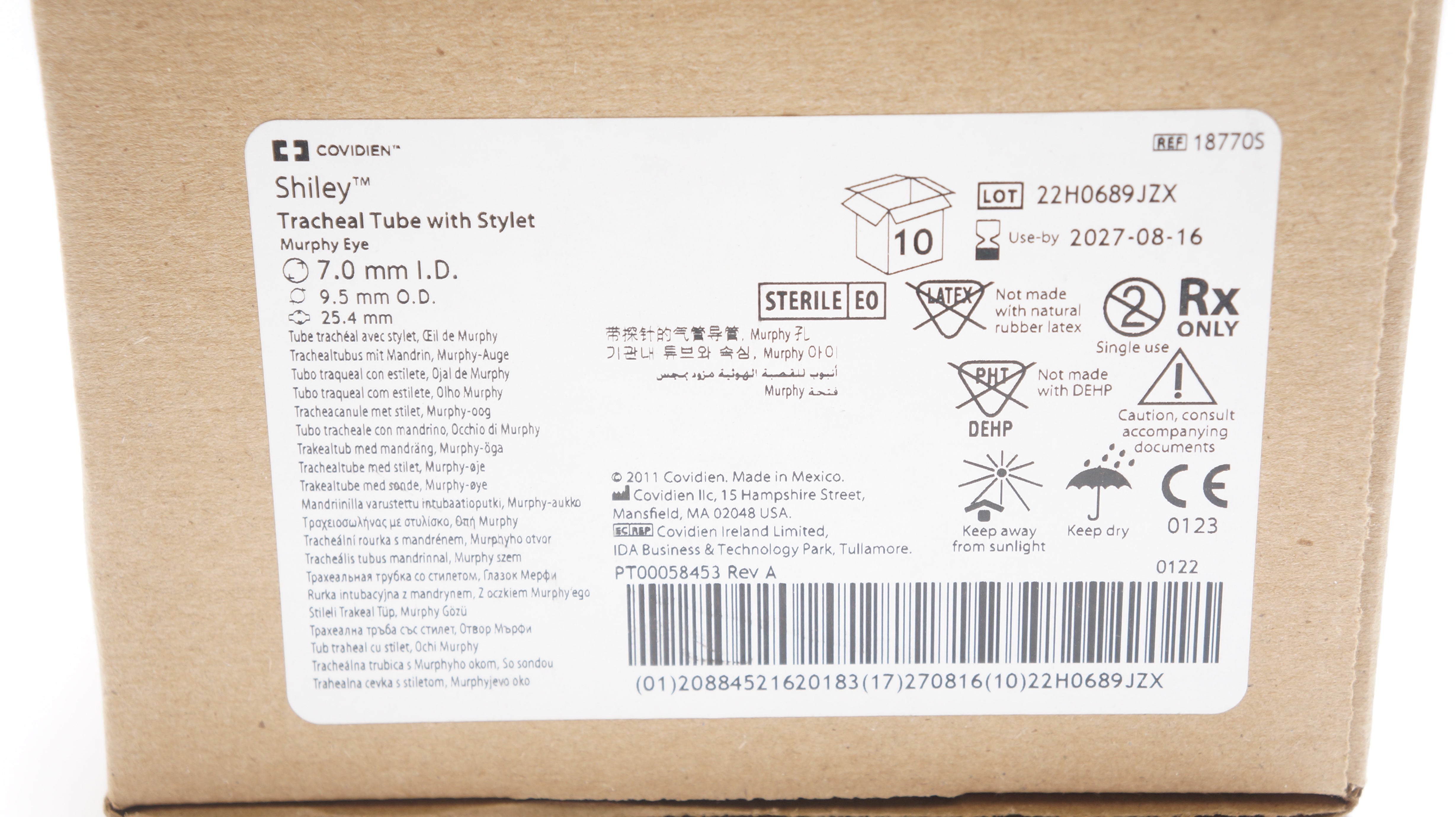 Covidien 18770S Shiley Tracheal Tube with Stylet 7.0mm ID x 9.5mm OD x 25.4mm